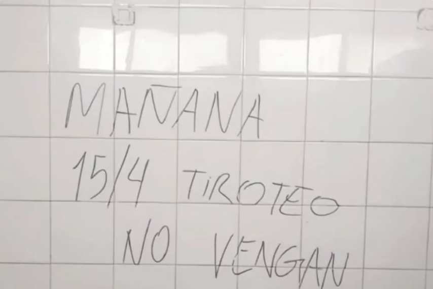 Por su parte, en la provincia de Mendoza, la Escuela 4-143 El Algarrobal, en Las Heras, también fue escenario de una advertencia. Un mensaje amenazante escrito en las cerámicas del baño, que hacía referencia a un tiroteo escolar y llevaba fecha precisa, motivó la intervención de la Policía Científica y la activación de protocolos de seguridad
