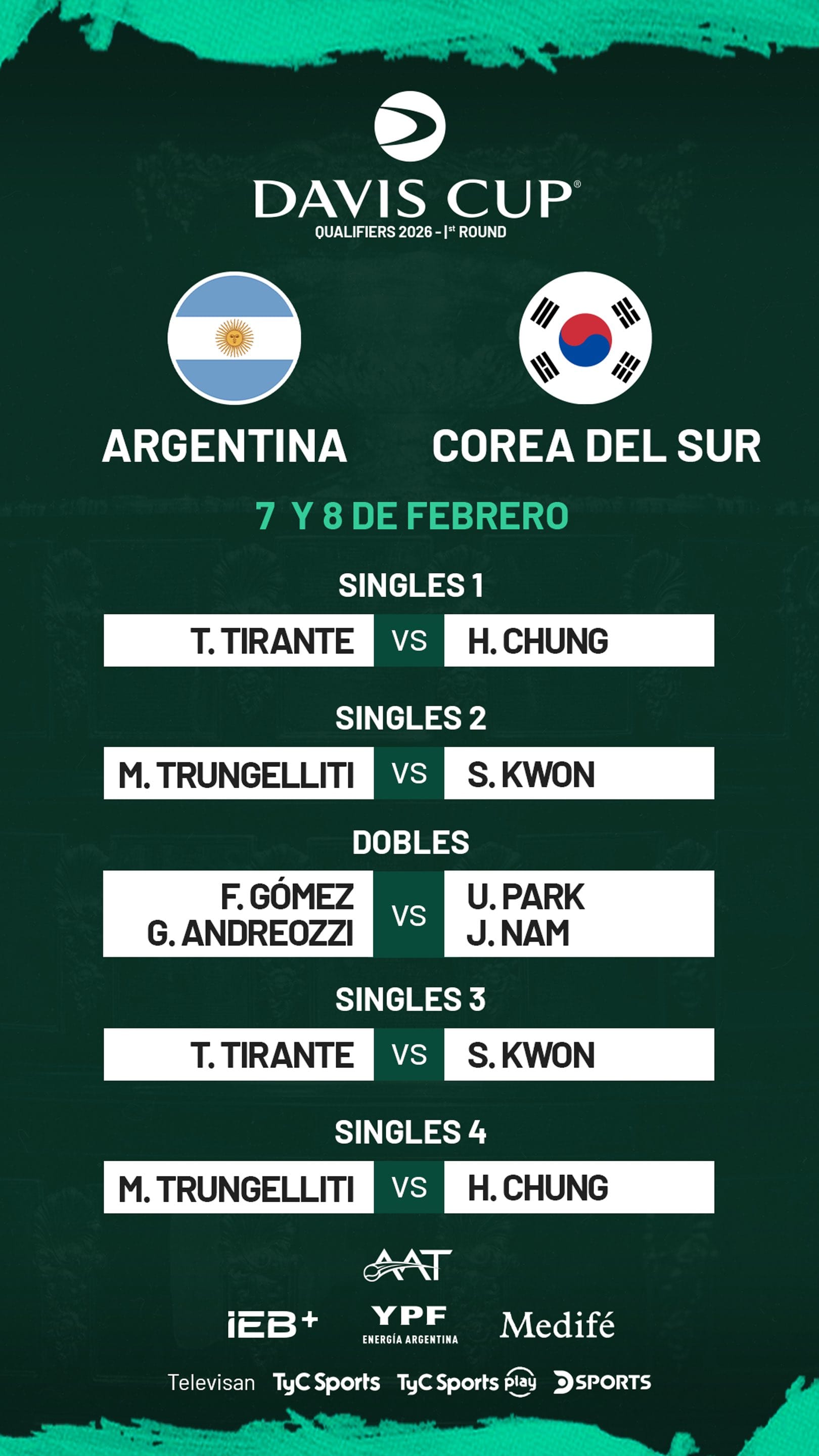 El capitán del equipo nacional, Javier Frana, confirmó que Thiago Tirante y Marco Trungelliti serán los encargados de abrir los primeros puntos de singles, mientras que el dobles quedará en manos de Guido Andreozzi y Federico Gómez, programado para la segunda jornada de competencia.