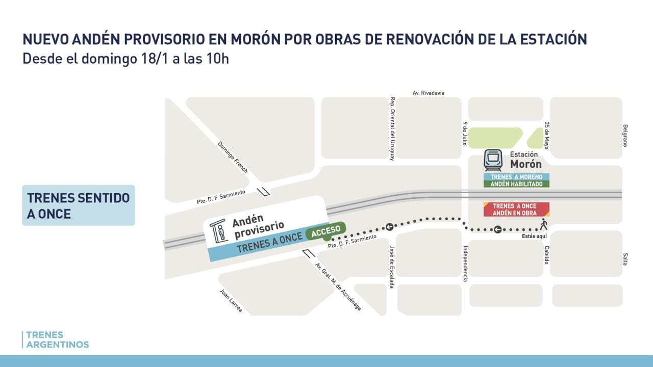 Los trenes de la línea Sarmiento con destino a Once comenzarán a detenerse en el andén provisorio de la estación Morón, ubicado en la intersección de Sarmiento y Azcuénaga, a partir del domingo 18 de enero. La medida fue adoptada por el inicio de los trabajos de renovación integral de la parada ferroviaria que se ejecutan en el marco de la Emergencia Ferroviaria decretada por el Gobierno Nacional.