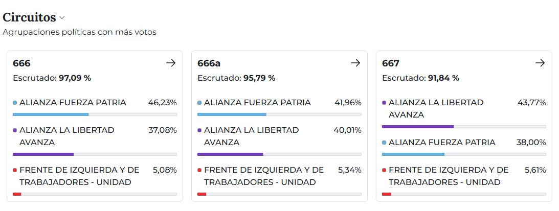 En relación a los 3 circuitos electorales en los que está dividido Ituzaingó, el peronismo se impuso en 2 (666a (Villa Udaondo y 666(Villa León)) y La Libertad Avanza se impuso en el 667 (Centro de la ciudad)