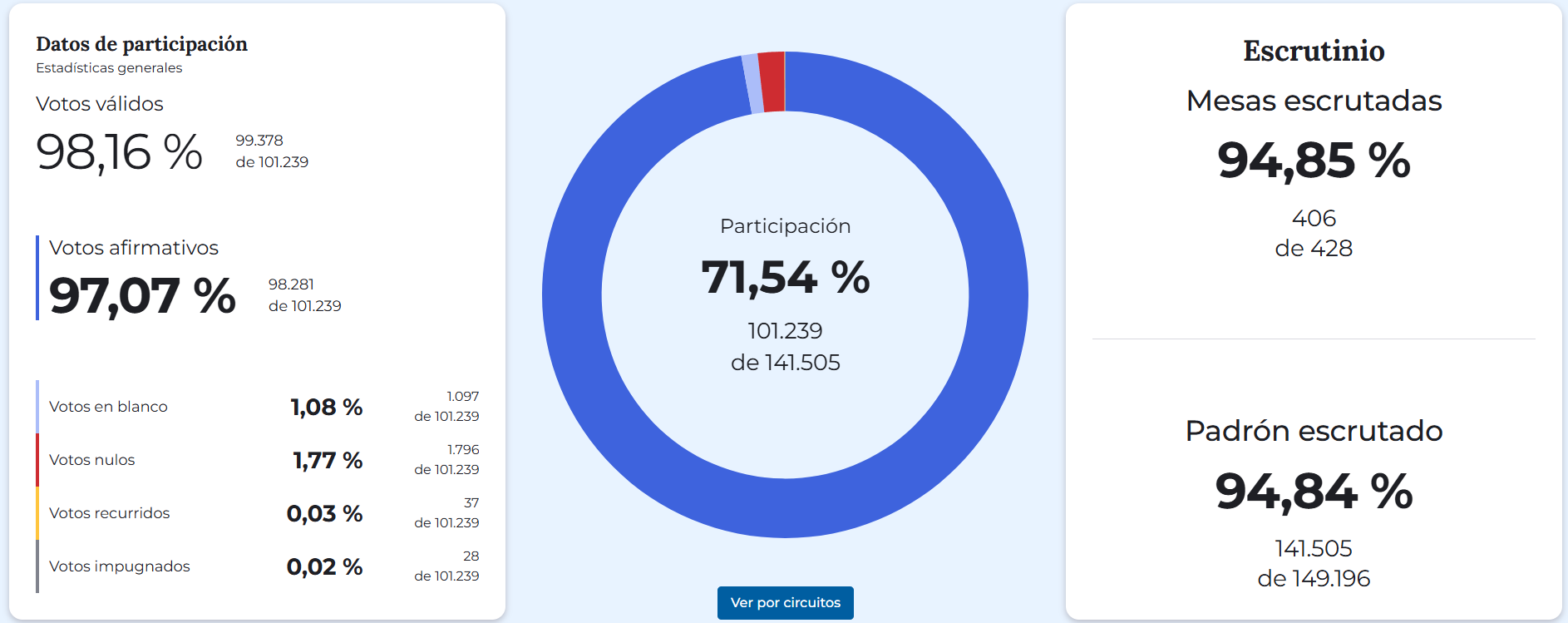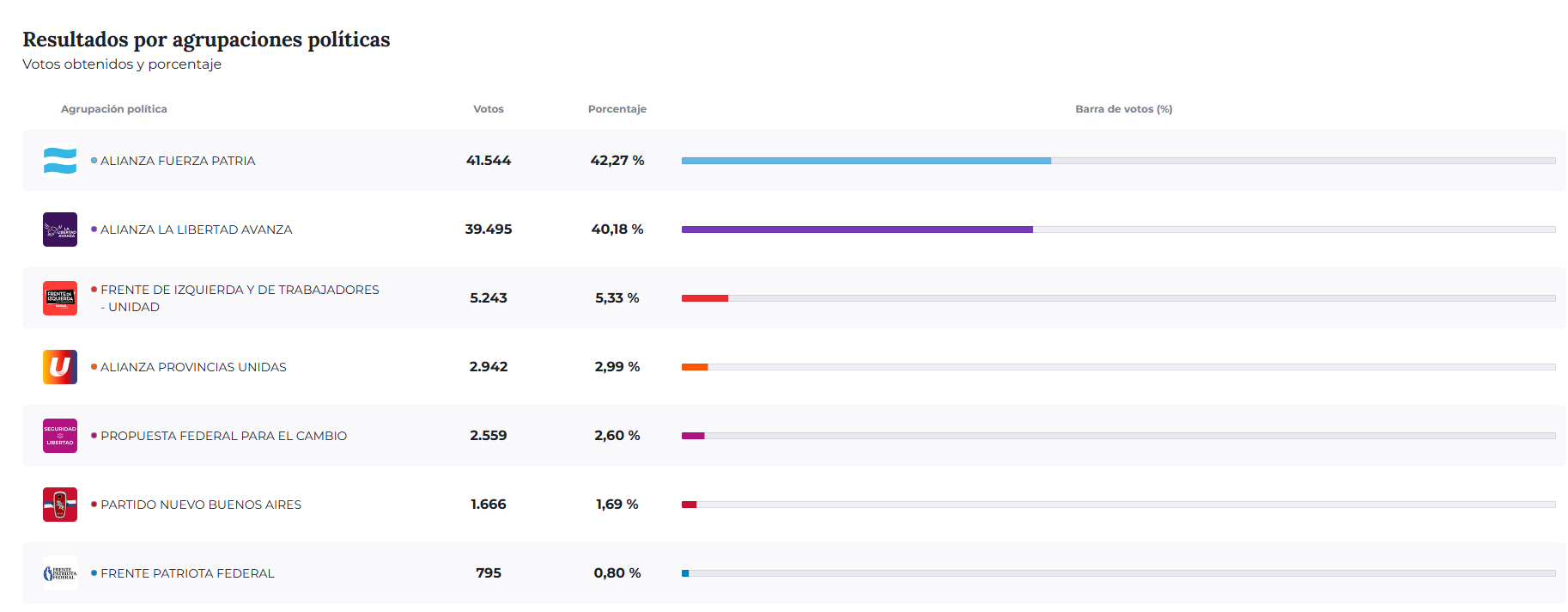 En nuestro municipio, computado mas del 90 % de los votos, el peronismo alcanzó el 42,27 % sobre e l 40,18% de los libertarios. La participación del electorado sobre el padrón, alcanzó el 71,54 %, 5 puntos más que el 7 de septiembre
