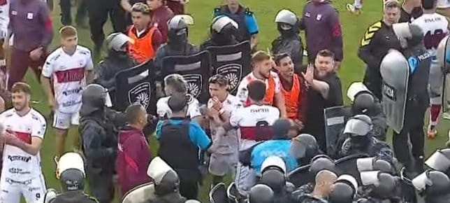 Tras el final del partido en el que Deportivo Madryn derrotó 1-0 a Deportivo Morón, hubo fuertes cruces con golpes de puño incluidos entre los futbolistas y también, de los jugadores visitantes con la policía. #AscensoEnDSPORTS pic.twitter.com/nR59ubmZNo