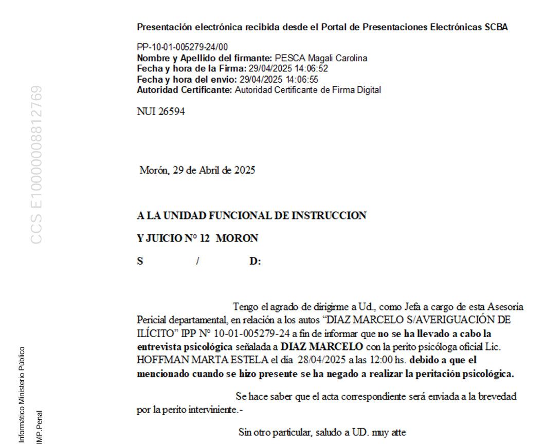 Sin embargo, ante la citación oficial, el acusado hizo uso de su derecho de negarse a someterse a dichas entrevistas y evaluaciones técnicas. Si bien esta negativa forma parte de las garantías constitucionales que protegen al imputado de no declarar contra sí mismo, en el ámbito del derecho penal de la Provincia de Buenos Aires, este tipo de reticencia no pasa inadvertida para los magistrados.