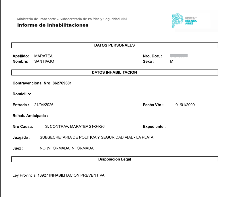 En ese sentido, la Subsecretaría de Política y Seguridad Vial dispuso la inhabilitación preventiva para conducir, en el marco de sus facultades, quedando a disposición de la Justicia de Faltas correspondiente.