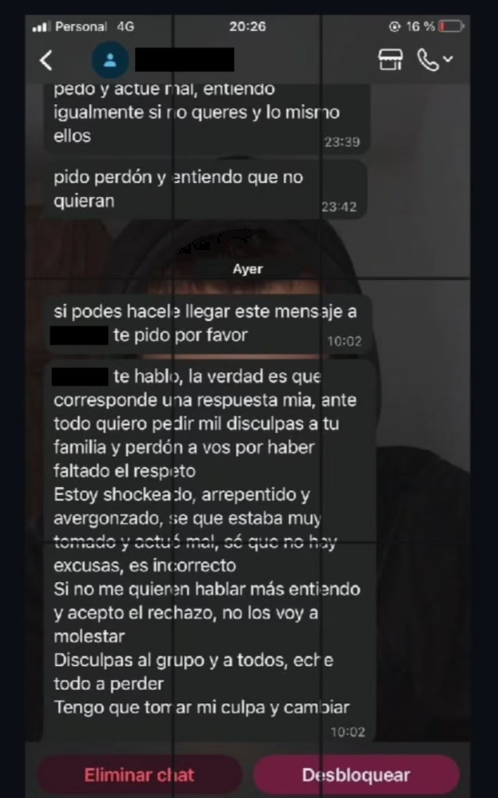 Tras descubrir lo sucedido, la familia confrontó al joven de 24 años. El acusado reconoció los hechos, atribuyendo su conducta al consumo de alcohol. Posteriormente, envió mensajes de texto pidiendo disculpas y manifestando vergüenza, antes de cerrar sus perfiles en redes sociales ante la escalada del conflicto.