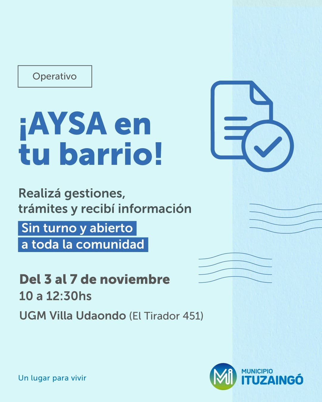 Esta nueva edición de "AySA en tu barrio" se desarrollará en la UGM "Villa Udaondo" (El Tirador 451), de forma totalmente abierta a la comunidad. En cuanto al horario de atención al público, se ha informado que este será de 10:00 a 12:30hs y la misma se brindará -sin la necesidad de tener que solicitar un turno previamente- hasta el viernes 22 de agosto.