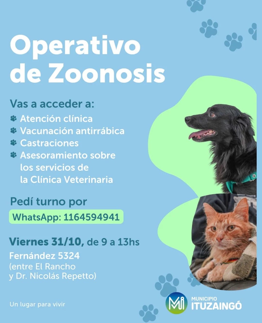 Para darle un cierre a octubre, desde el equipo de profesionales de la Clínica Veterinaria Municipal y Zoonosis anunciaron que llevarán adelante un nuevo operativo para continuar promoviendo el cuidado de la salud de las mascotas ituzainguenses. De esta forma, los vecinos de Barrio Nuevo contarán con la posibilidad de acercarse a este operativo -solicitando turno previamente al 1164594941- y acceder  a los diferentes servicios que se encontrarán disponibles.