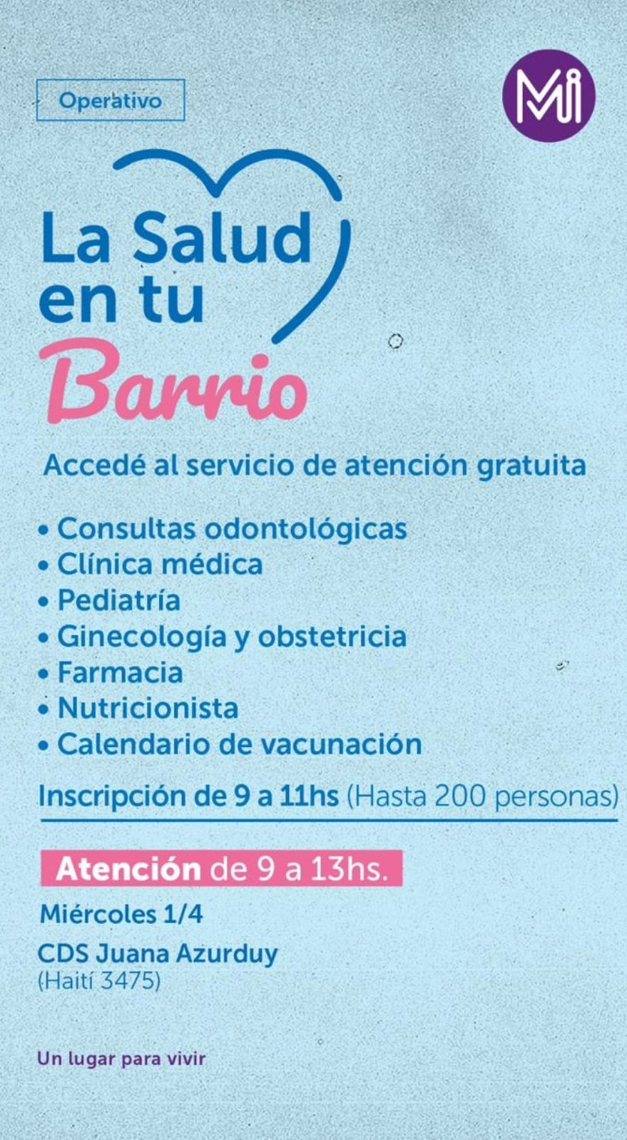 Este operativo se llevará adelante, el próximo miércoles 1 de abril a partir de las 9:00hs, en el Centro de Desarrollo Social "Juana Azurduy" (Haití 3475). Es importante destacar que, al igual que en ediciones anteriores, los diferentes vecinos que se acerque se encontrarán con varias propuestas médicas que van desde atención clínica, nutricionistas, calendario de vacunación y pediatría hasta ginecología y obstetricia.