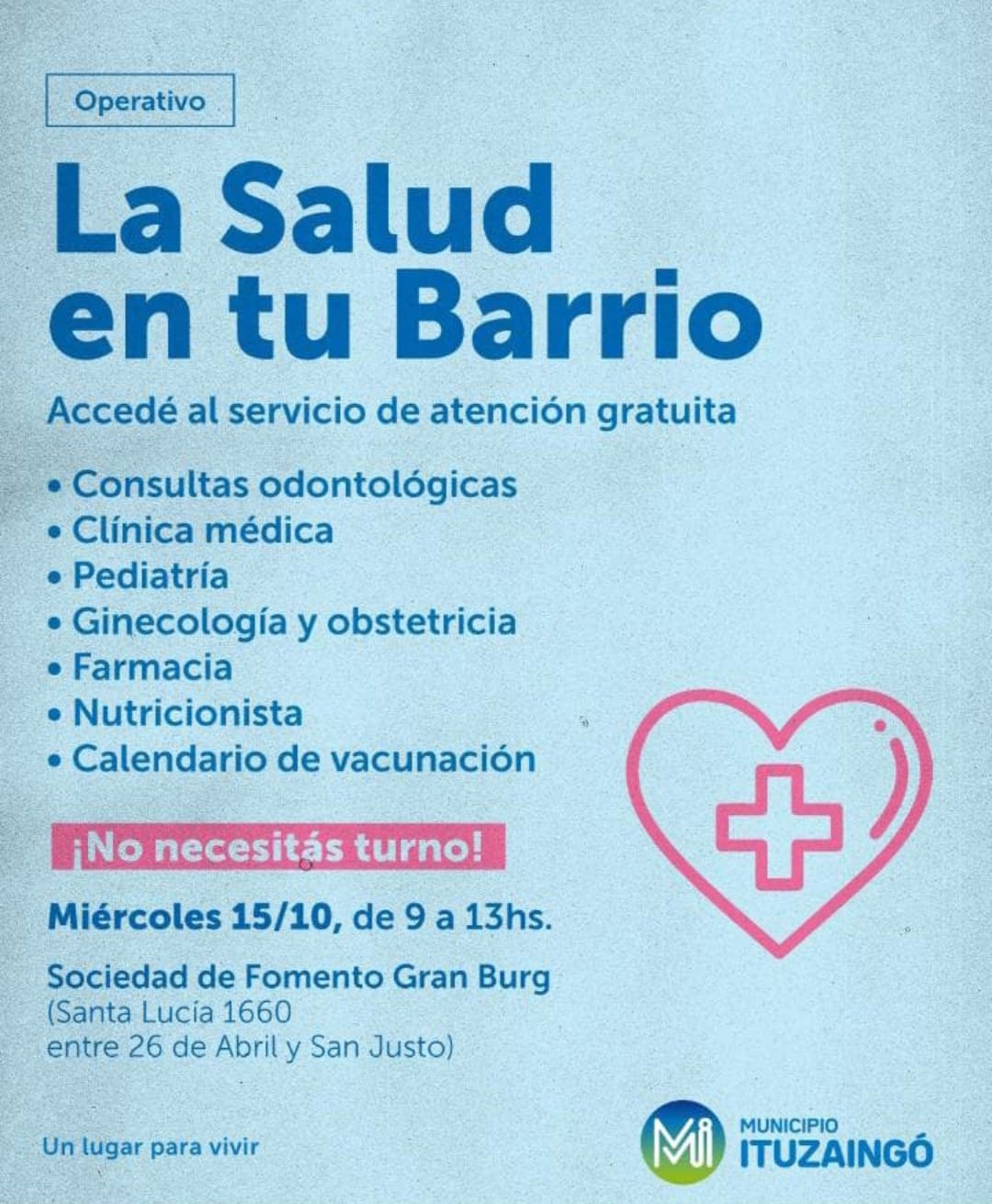 Este operativo se llevará adelante, el próximo miércoles 15 de octubre a partir de las 9:00hs, en la Sociedad de Fomento "Grand Bourg" (Santa Lucía 1660). Al igual que en ediciones anteriores, los diferentes vecinos que se acerque se encontrarán con varias propuestas médicas que van desde atención clínica, nutricionistas, calendario de vacunación y pediatría hasta ginecología y obstetricia.