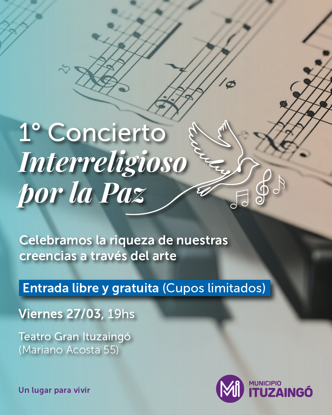 El Municipio de Ituzaingó invita a los vecinos a una jornada histórica de convivencia y cultura. Bajo el lema "Celebramos la riqueza de nuestras creencias a través del arte", el encuentro reunirá a diversas instituciones religiosas, coros y artistas de renombre en un mismo escenario. La cita es a las 19:00 horas en el Teatro Gran Ituzaingó, ubicado en Mariano Acosta 55, con entrada libre y gratuita hasta agotar la capacidad de la sala.