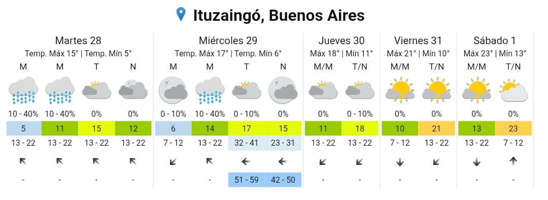 De esta manera, es necesario señalar que -en partidos bonaerenses como Ituzaingó, Morón, Hurlingham y Merlo, entre otros- los vecinos y vecinas deberán tener en cuenta la presencia de algún abrigo al salir temprano de sus hogares. En cuanto al martes 28 de octubre, es importante remarcar que este será el día más fresco de la semana ya que se espera una mínima de 5 y 15 grados de máxima.