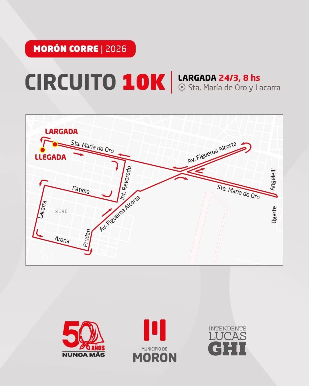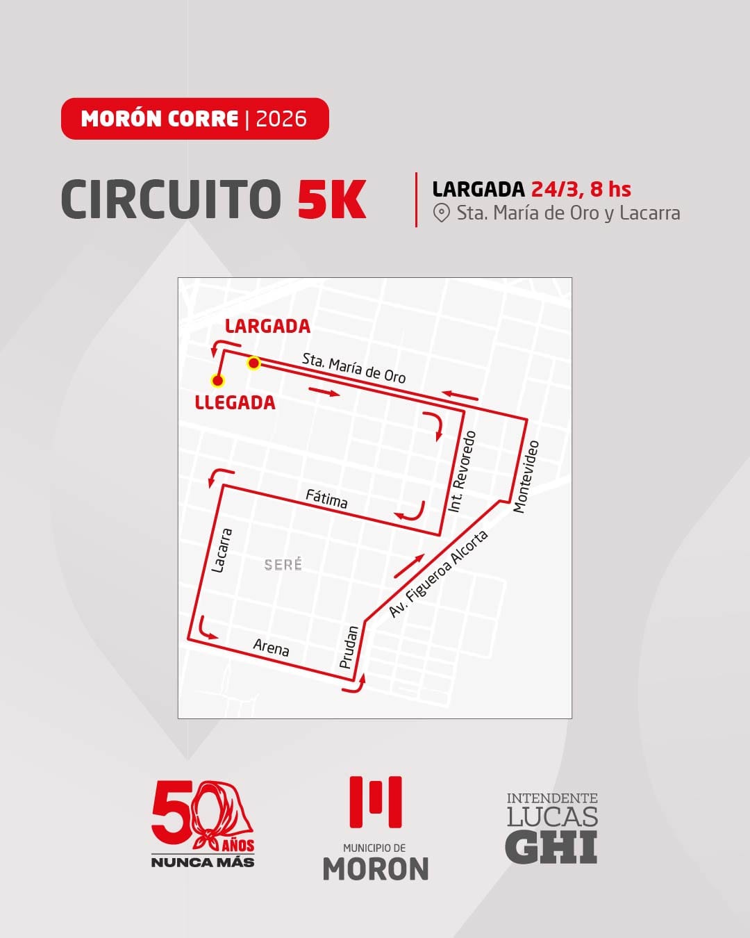 La prueba atlética que une deporte y memoria contará con dos modalidades de circuitos para que ningún vecino o vecina se quede sin participar. Habrá un circuito de 5K y otro más largo, de 10K que contemplará un recorrido por distintos espacios de Morón.