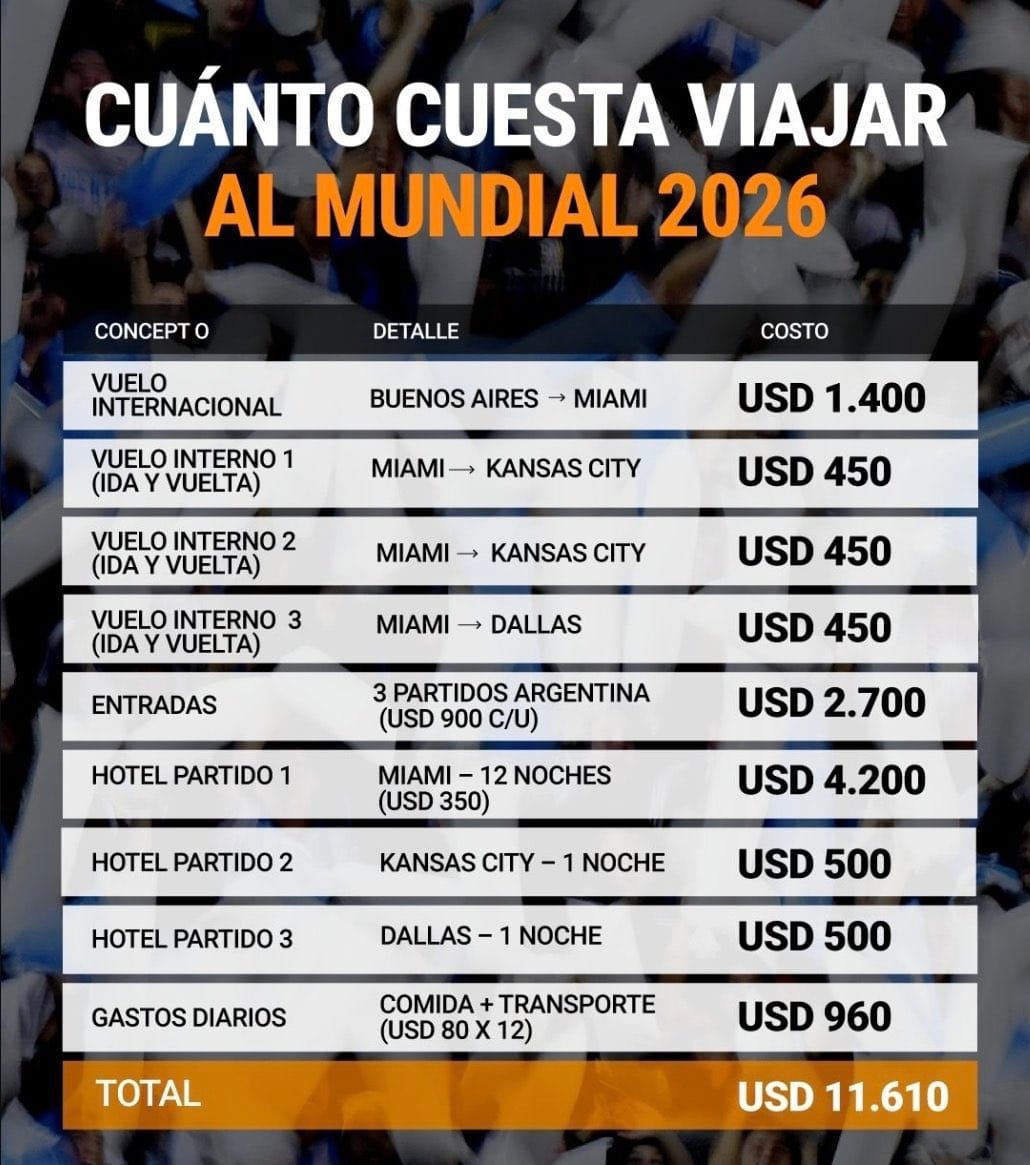 De acuerdo con estimaciones difundidas en un análisis televisivo, el gasto total para presenciar los tres partidos de fase de grupos de Argentina podría superar los USD 11.000, lo que equivale aproximadamente a $16 millones al tipo de cambio actual.