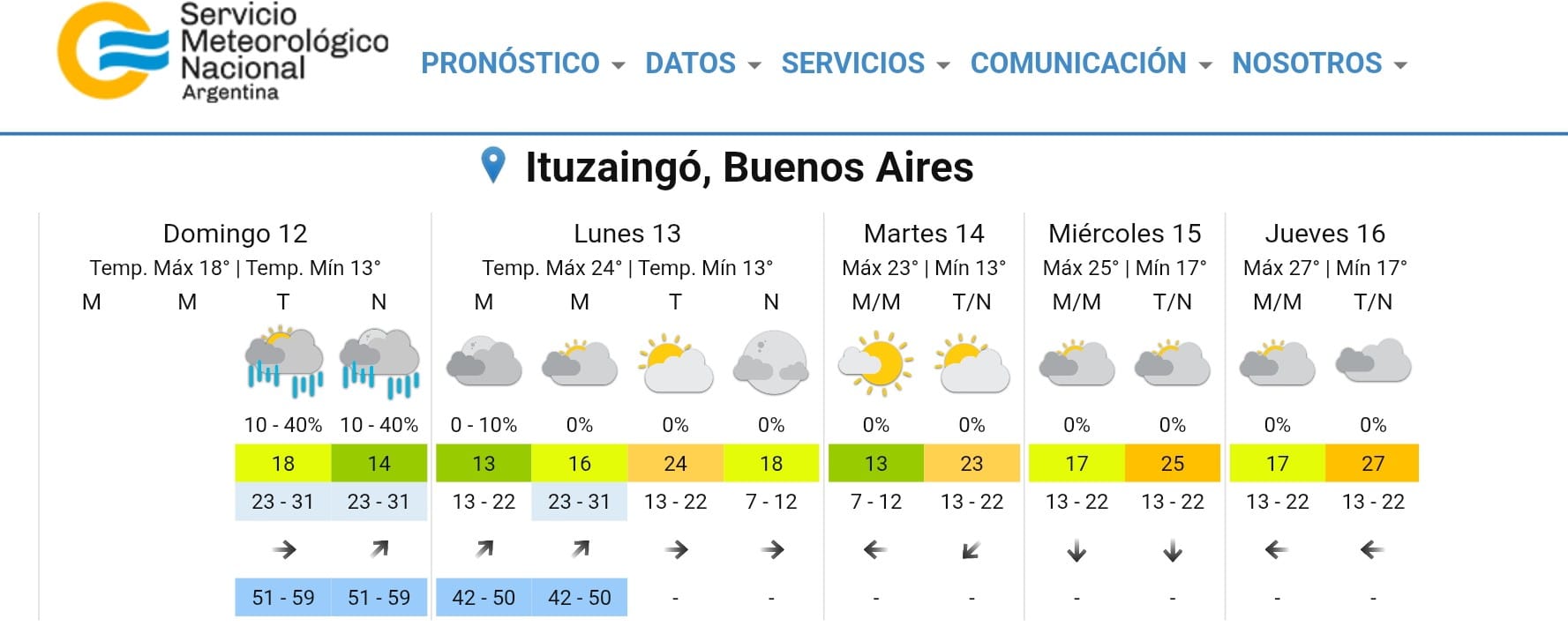 En cuanto al pronóstico correspondiente para esta semana, resulta interesante señalar que persistirá la presencia de nubosidad en el cielo pero con un aumento de la temperatura, la cual subirá con el correr de los siguientes días. Este es el caso del lunes 13 de octubre, en donde la probabilidad de lluvias será apenas del 10% y la temperaturá oscilará entre los 13 y los 24 grados.
